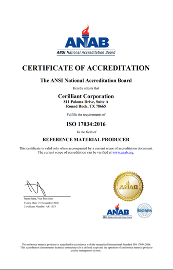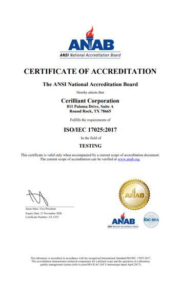 Cerilliant的ISO 9001:2015标准认证涵盖了其所有运营,包括一般质量实践;有机合成;参考标准制造、测试和认证;以及客户和技术服务。自1997年以来获得认证。