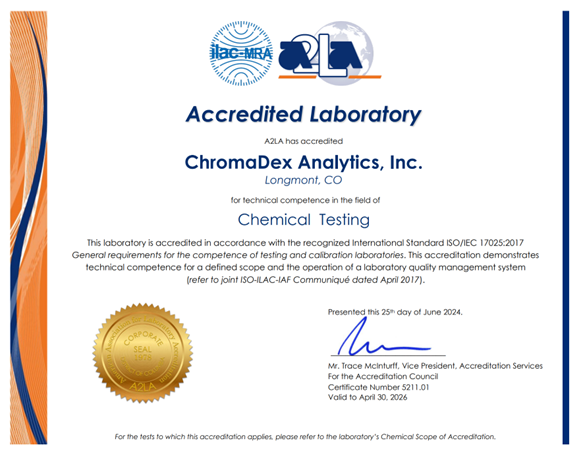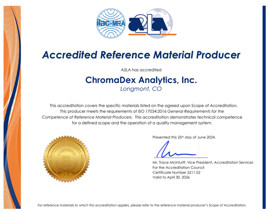 ChromaDex实验室获得ISO/IEC 17025:2017认证,这意味着该实验室符合化学测试领域的计划要求。认证证明了以下链接中定义的范围的技术能力以及实验室质量管理体系的运作。此外,ChromaDex是一家获得ISO 17034:2016认证的参考材料生产商,涵盖了下面另一个链接中列出的范围内的特定材料。