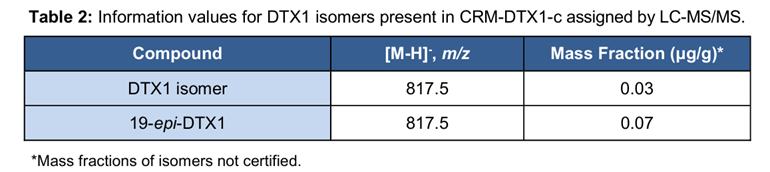 鳍藻毒素1校准溶液是从甲藻物种原甲藻的实验室培养物中分离出来的,并在哈利法克斯的加拿大国家研究委员会(NRC)通过几个色谱步骤进行纯化。DTX1的结构和纯度通过1H NMR、LC高分辨率MS(LC-HRMS)和LC-MS/MS进行了确认。使用LC-HRMS,DTX1的[mH]-离子的测量准确m/z为817.4756(对于C45H69O-,∆m=1.5ppm)(图1A)。碰撞诱导解离光谱(图1B)与之前的DTX1 CRM和文献报道[4]相匹配。LC-MS/MS分析显示,少量DTX1平衡产物暂定为19-epi-DTX1,另一种DTX1异构体低于DTX1的1%(图2)[3]。表2中提供了这些异构体的近似质量分数作为未经认证的信息值。鳍藻毒素1标准物质