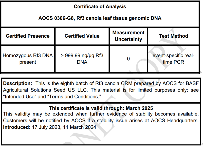 AOCS 0306-G8,Rf3转基因油菜叶片组织基因组DNA标准品同质性使用巴斯夫农业解决方案种子美国有限责任公司开发和验证的事件特异性定性PCR方法对10个包装样品进行了测试。从弗吉尼亚州尚蒂伊的FoodChain ID Testing,LLC(ISO 17025认证的实验室)收到的定性、事件特异性分析的测试结果均与报告的Rf3性状的存在一致