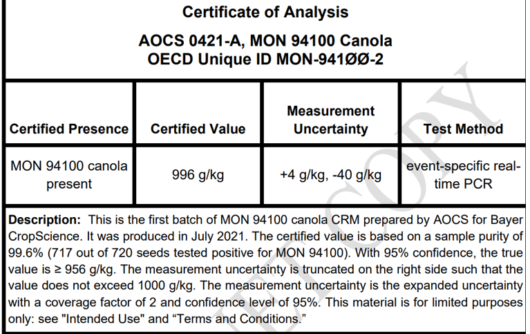 MON 94100 Canola OECD Unique ID MON-941ØØ-2 This is the first batch of MON 94100 canola CRM prepared by AOCS for Bayer CropScience. It was produced in July 2021. The certified value is based on a sample purity of 99.6% (717 out of 720 seeds tested positive for MON 94100). With 95% confidence, the true