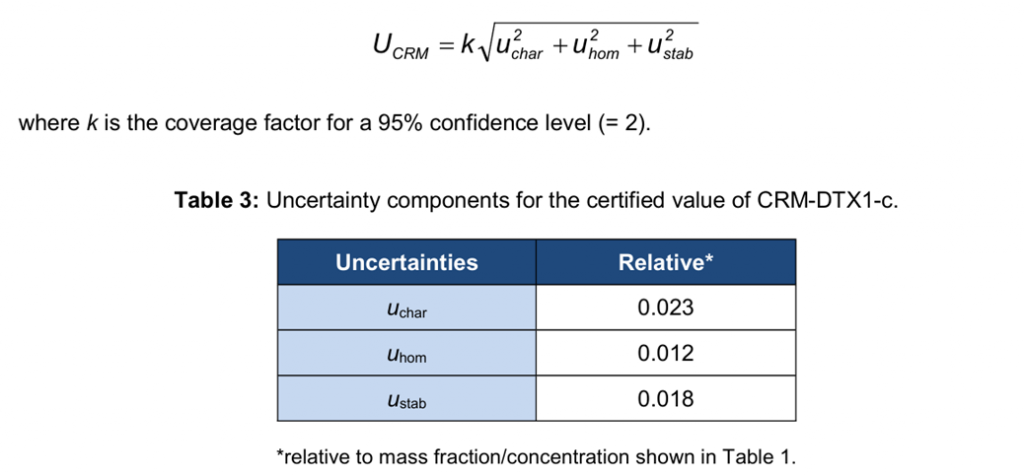 考虑并测量了与CRM-DTX1-c表征相关的所有合理误差源。总体不确定性估计(UCRM)包括与批次表征(uchar)、瓶间变化(uhom)和储存过程中的不稳定性(ustab)相关的不确定性[6-8]。表3列出了这些组件,它们的组合和扩展如下: