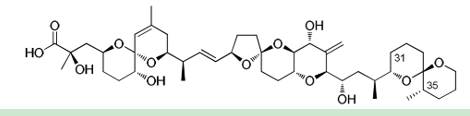 DTX2是从爱尔兰西南海岸收获的受污染贻贝(Mytilus edulis)组织中分离出来的。DTX2的制备提取和纯化在爱尔兰海洋研究所进行,一些最终纯化在哈利法克斯国家研究委员会进行。DTX2的结构和纯度通过1H NMR和LC-MS/MS进行了确认。使用高分辨率MS获得了DTX2的[m-H]-离子的测量准确m/z为803.4590±0.0001(对于C44H67O13-,∆=+0.4 ppm)(图1A)。碰撞诱导解离光谱(图1B)与之前的DTX2 CRM和文献报道[3]相匹配。CRM-DTX2-b含有少量(~1%)异构杂质(图2)。