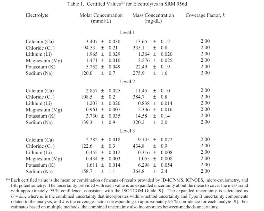 冷冻人血清中的电解质标准品(SRM)主要用于校准和验证临床分析中用于测定稀释或未稀释人类血清或血浆中电解质的程序和方法。该SRM可用于校准直读离子选择电极(ISE)分析仪[1],并用于验证二次参考材料的质量保证。SRM 956d的一个单元由六个冷冻人血清的密封硼硅酸盐玻璃安瓿组成,每个安瓿有三个不同的浓度水平。每个安瓿含有大约2毫升人血清。认证值:表1列出了每种材料中电解质的认证浓度值,表示基于单一主要方法测量的结果平均值,钠除外。钙(Ca)、锂(Li)、镁(Mg)和钾(K)的认证浓度基于同位素稀释电感耦合等离子体质谱法(ID-ICP-MS)的测量[2-5]。氯化物的认证浓度基于微库仑法[4]的测量结果。钠的认证浓度基于电感耦合等离子体发射光谱法(ICP-OES)和ISE电位法。所有分析物值均被证明为总元素。为了方便起见,认证浓度值以mmol/L和mg/dL为单位表示。NIST认证值是指NIST对其准确性具有最高信心的值,因为所有已知或怀疑的偏差来源都已被调查或考虑[6]。被测物是表1中报告的电解质浓度。计量可追溯性是指质量浓度(以毫克/分升表示)和物质浓度(以毫摩尔/升表示)的SI衍生单位。