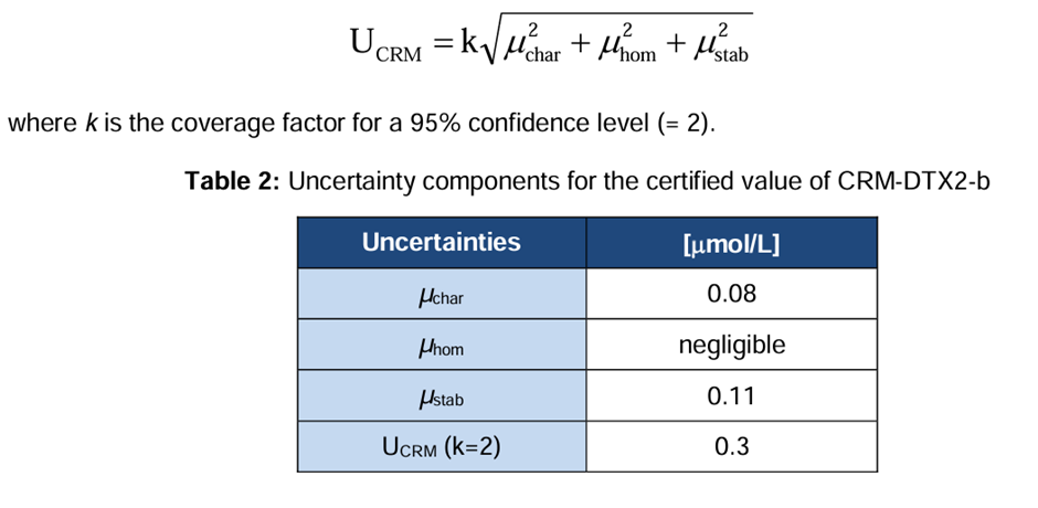 考虑并定量了与CRM-DTX2-b表征相关的所有合理误差来源。包括与所使用的两种分析方法相关的组合不确定度分量(µchar)。总体不确定度估计(UCRM)包括与批次表征(µchar)、瓶间变化(µhom)和长期储存期间的不稳定性(µstab)相关的不确定性[5-7]. 表2中列出了这些组件,它们的组合和扩展如下: