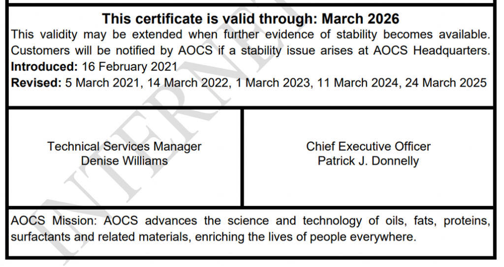 本报告描述了AOCS技术服务公司于2017年生产的菜籽油CRM AOCS 0711-A4的制备和认证。CRM是根据ISO 17034:2016制备的,旨在作为第三方测试油菜籽转化事件的控制材料。路易斯安那州新奥尔良Eurofins GeneScan(ISO 17025认证实验室)使用事件特异性定性PCR分析验证了油菜中Ms1的存在。AOCS 0711-A4有0.5毫升带踢脚线的螺旋盖自封管。油菜Ms1 DNA由BASF Agricultural Solutions Seed US LLC提供,从干净的叶子中提取。叶片DNA提取物样品应干燥储存在+4°C的密封容器中,置于黑暗中。