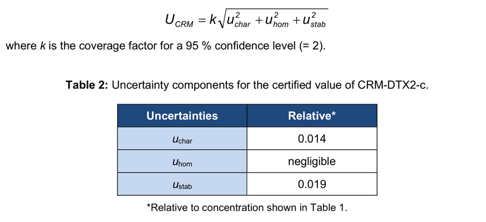 考虑并测量了与CRM-DTX2-c表征相关的所有合理的不确定度来源。总体不确定性估计(UCRM)包括与批次表征(uchar)和储存过程中的不稳定性(ustab)相关的不确定性[8]。表2中列出了这些组件,它们的组合和扩展如下: