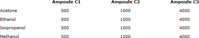A multicomponent calibration kit containing acetone, ethanol, isopropanol, and methanol at concentrations of 500, 1000, and 4000 µg/mL. This kit is suitable for calibration of blood alcohol testing methods using GC Headspace.Multicomponent Alcohol Calibration Kit (C1-C3)