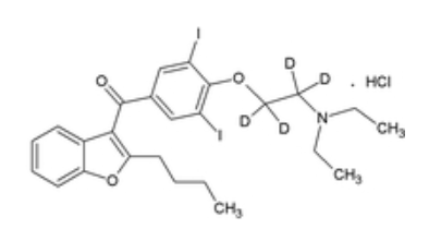 A Certified Spiking Solution® and stable-labeled internal standard for use in therapeutic drug monitoring analyses by LC/MS. Amiodarone, an antiarrhythmic agent marketed as Pacerone, Cordarone, Aratac, Atlansi, is monitored by clinical labs to ensure patients remain within the drug’s therapeutic range.Amiodarone-D4 HCl