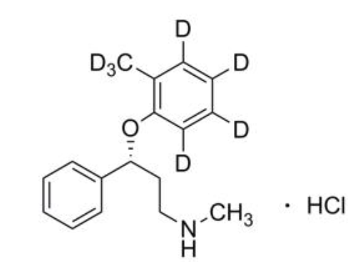 A stable-labeled internal standard suitable for numerous GC/MS and LC/MS applications for atomoxetine from clinical toxicology and urine drug testing to forensic analysis and isotope dilution methods. Atomoxetine, marketed in the US under the trade name Strattera®, is a drug used in the treatment of attention-deficit hyperactivity disorder (ADHD).Atomoxetine-D7 HCl/