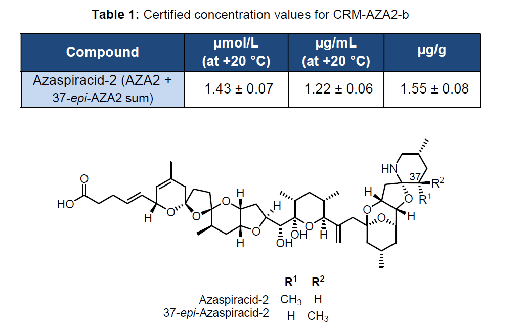 原多甲藻酸毒素(AZAs)是1995年在爱尔兰首次发现的一类强效贝类毒素,此前发生了与食用贝类有关的人类中毒事件[1,2]。AZAs具有独特的具有羧基和胺部分的螺环组装体[3,4]。AZAs的起源已被确定为甲藻Azadinium spinosum[5]。中毒症状包括恶心、胃痉挛、头痛、呕吐和腹泻。贝类中AZAs(AZA1、AZA2和AZA3)的最大允许总水平目前为整个组织中0.16 mg/kg[6]。CRM-AZA2-b是AZA2在甲醇中的认证校准溶液,是2011年发布的CRM-AZA2的替代品。