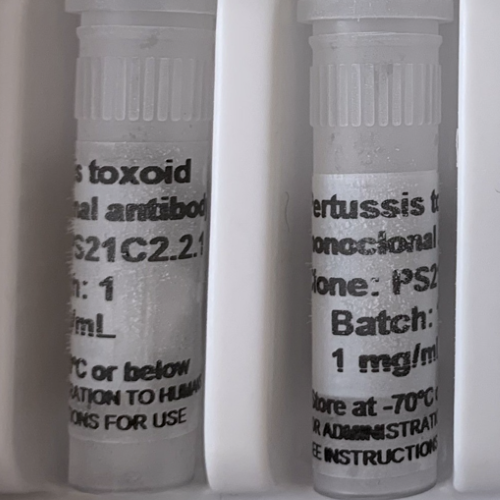 生物材料原产国:法国。每瓶含有0.5ml总蛋白浓度为1mg/ml的液体抗百日咳类毒素单克隆抗体克隆PS21C2.2.1。PS21C2.2..1是由杂交瘤和纯化的蛋白a产生的小鼠IgG1抗体。抗体在pH 7.4的磷酸盐缓冲液(155 mM NaCl、50 mM Na2HPO4和1.8 mM KH2PO4)中。抗体经过过滤(0.2µM),不含防腐剂。