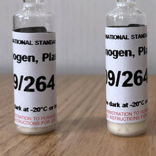 人血浆中纤维蛋白原国际标准物质活性单位 世界卫生组织纤维蛋白原血浆第三国际标准,由冷冻干燥溶剂清洁剂处理的合并正常人血浆等分试样组成,于2010年1月在国家生物标准与控制研究所(NIBSC)制备。在50单位(10000毫升)的产品解冻后,将该材料汇集并保持在冰上,然后在NIBSC的密封玻璃安瓿中填充并冷冻干燥,条件符合国际标准1。将1ml这种材料分配到大约10000个安瓿中的每个安瓿中。基于396个检查重量样品,平均填充重量为1.0080 g(范围为1.0020 g至1.0150 g),变异系数(CV)为0.18%。冷冻干燥后的平均残余水分为0.34%(CV 24.8%,n=12),平均氧气顶部空间为0.29%(CV 32.2%,n=12中)。