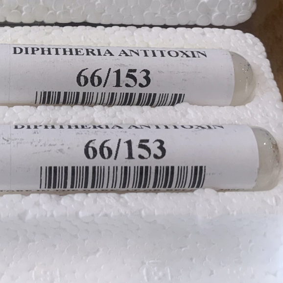 马白喉抗毒素标准品生物材料的原产国:英国。每安瓿含有1.0毫升马血清的冻干残留物。